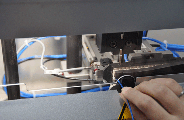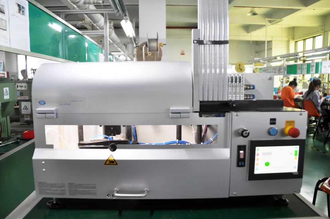 | 這臺來自德國的設(shè)備讓威貿(mào)的小伙伴們操作更輕松、更穩(wěn)定。我們只需將電線放入設(shè)備的壓接槽中,感應(yīng)器自動定位并壓接,一條完整的線就出來啦! | ||