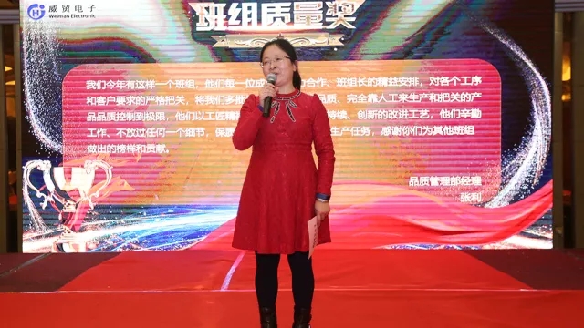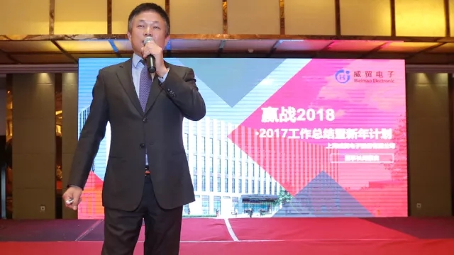 威貿(mào)電子董事長周豪良先生上臺為大家致開幕詞,總結(jié)2017成果并發(fā)表2018新年計劃。2017年,威貿(mào)產(chǎn)值15000萬元左右,創(chuàng)歷年最高。在質(zhì)量方面,公司整體客訴率下降16.45%,客戶滿意度從前三年的78%提升到90.6%
