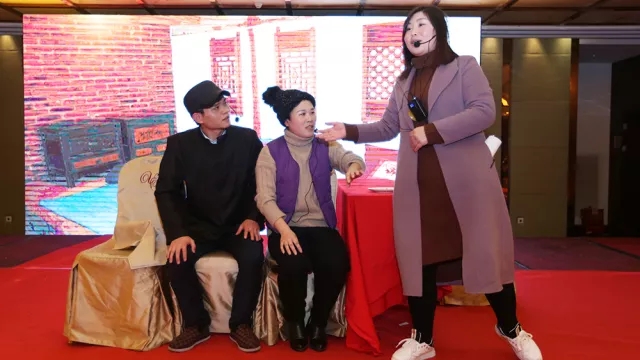 一句“下蛋公雞,公雞中的戰(zhàn)斗機”,引得大家哄堂大笑。圍繞著這只神奇的公雞所展開的緊湊劇情,讓大家忘了桌上的美酒佳肴,沉浸在了演者們賣力的表演之中。