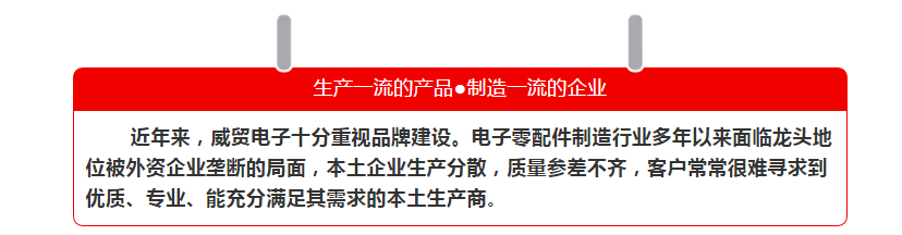 配合試點工作要求,威貿(mào)提出了“打造專業(yè)、專注的一站式頂尖電子零配件制造商企業(yè)形象”的品牌培育目標。公司新成立企劃部和以其為主體的品牌培育管理辦公室專職策劃實施品牌培育工作,建立了由總經(jīng)理領導、品牌培育管理辦公室負責、各部室具體執(zhí)行的品牌培育管理模式,全面調(diào)動公司內(nèi)外資源,落實各部門品牌培育相關工作。